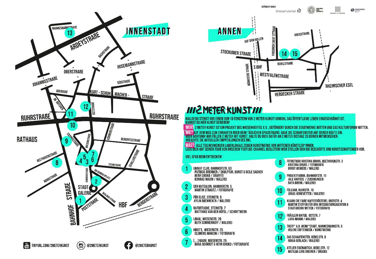 Inhaber*innen geschlossener Ladenlokale sowie geschlossene Kulturstätten stellen zwei Meter ihrer Schaufensterfläche als Ausstellungsort für Wittener Künstler*innen zur Verfügung. Angesprochen wird dabei explizit die Bandbreite Laien bis zu Wittener professionellen Kunstschaffenden.